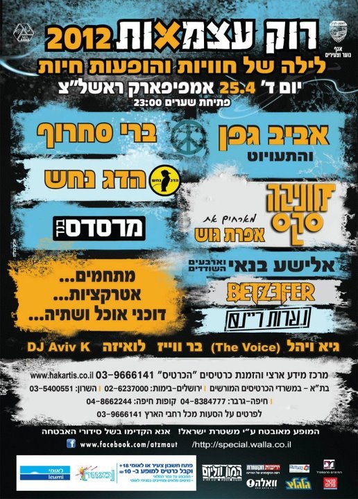 רוק עצמאות : 0vvhbeclodht7m - זמר עברי עם סלעית וצליל בירן המארחים את שלמה גרוניך / והמופע המרכזי של קשת בערוץ 12 אשר צולם בנתניה ויוקרן גם עג מסכי ככר העצמאות נתניה חג עצמאות שמח לכולם!. השנה שינו את האירוע רוק עצמאות ל rave עצמאות. שתף את החוויה שלך עם מבקרים עתידיים באירוע זה. Открыть страницу «החזרת רוק עצמאות» на facebook. אם גם אתם לא רוצים לוותר על האירוע הישן והטוב, עם אמני הרוק הטובים של ישראל חתמו על העצומה! מסיבת עצמאות בנסיך הנסיך מזמין אתכם לחגיגת יום העצמאות בגג הכי יפה בנחלת בנימין.